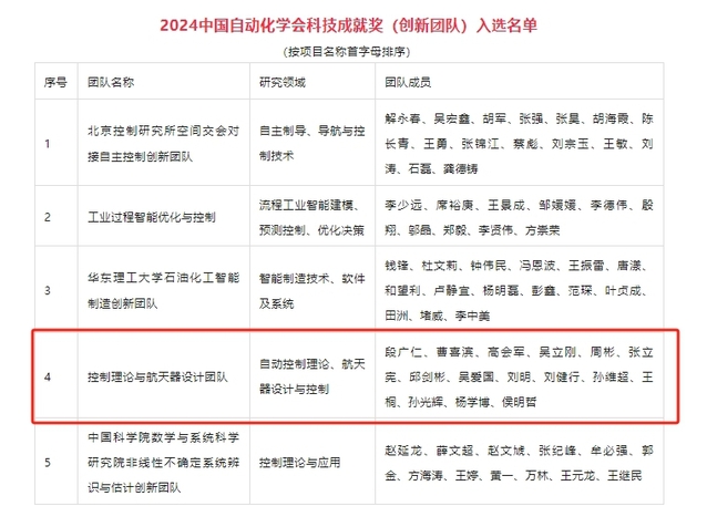 近日,2024中国自动化学会科技成就奖评审结果揭晓。四色av 控制理论与航天器设计团队荣获2024中国自动化学会科技成就奖(创新团队)。此次共评选出科技成就奖(创新团队)5项、科技成就奖(个人)2项。